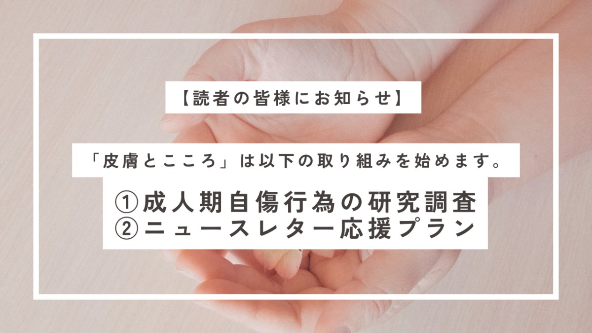 「皮膚とこころ」は、新たに①成人期自傷行為の研究調査と、②応援プランを始めます。